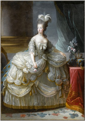 La reine Marie-Antoinette, femme du roi Louis XVI, m’a elle-même commandée auprès d’Elisabeth Vigée-Lebrun en 1788. En effet, dès 1778, sans attendre qu’Elisabeth Vigée-Lebrun ne soit élue à l’Académie royale de peinture et de sculpture, la reine en fit son peintre attitré. Ma créatrice fut donc une des rares peintres femmes, reconnue par ses pairs ! En me regardant, vous pouvez admirer la reine de France en habits d’apparat. Née en 1755, Marie-Antoinette de Lorraine-Habsbourg, archiduchesse d’Autriche, devint reine de France en 1775 lorsque Louis XVI accéda au trône. Je suis conservé à Versailles, au musée national des châteaux de Versailles et de Trianon, mais vous pouvez me voir actuellement à Arras . La tenue dans laquelle Marie-Antoinette est représentée était très imposante, il était difficile de passer les portes « standard », de ce fait des portes à double battant étaient installées à Versailles. De plus, la mode de l’époque imposait une perruque grise et un teint pâle, donc les nobles se maquillaient excessivement.